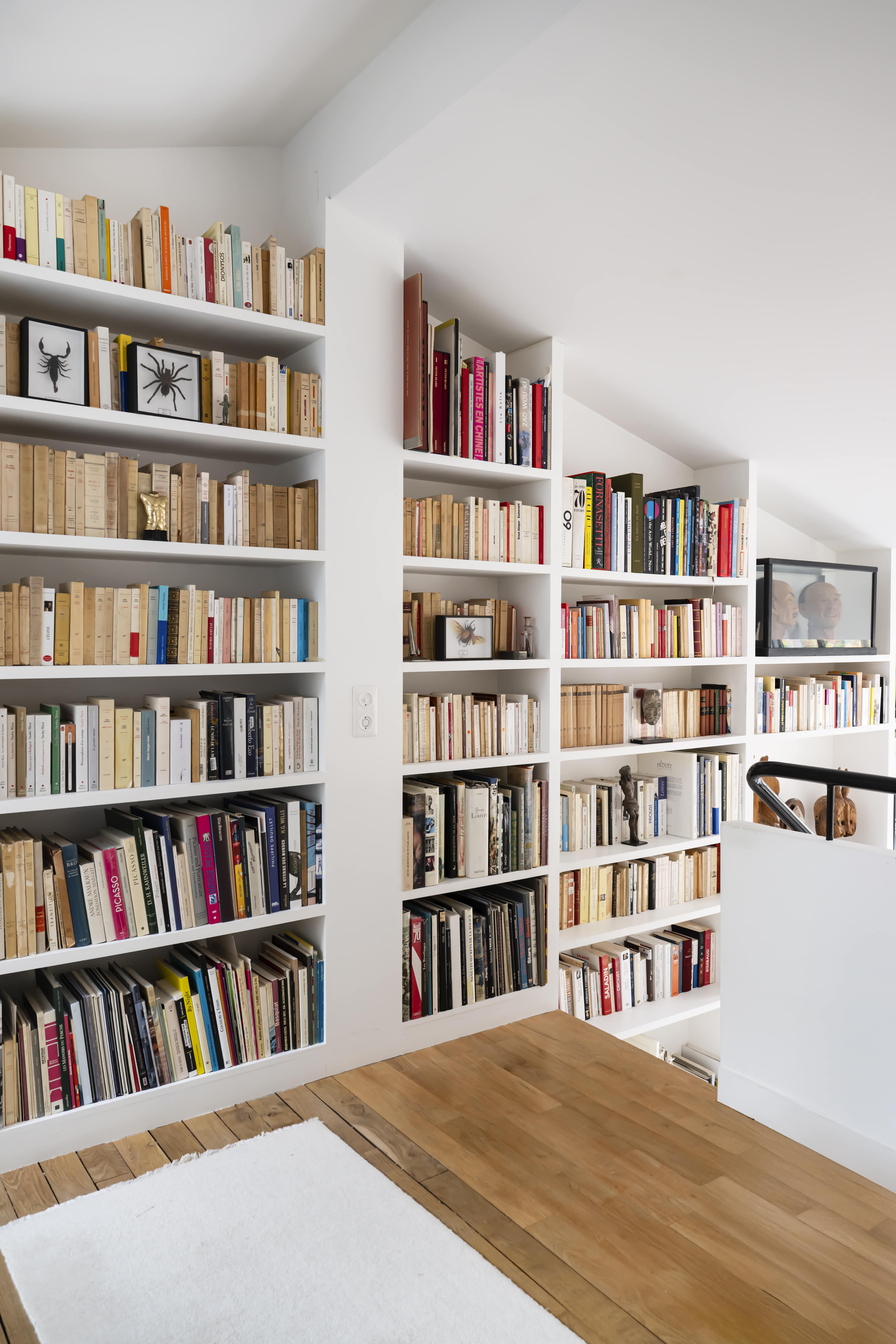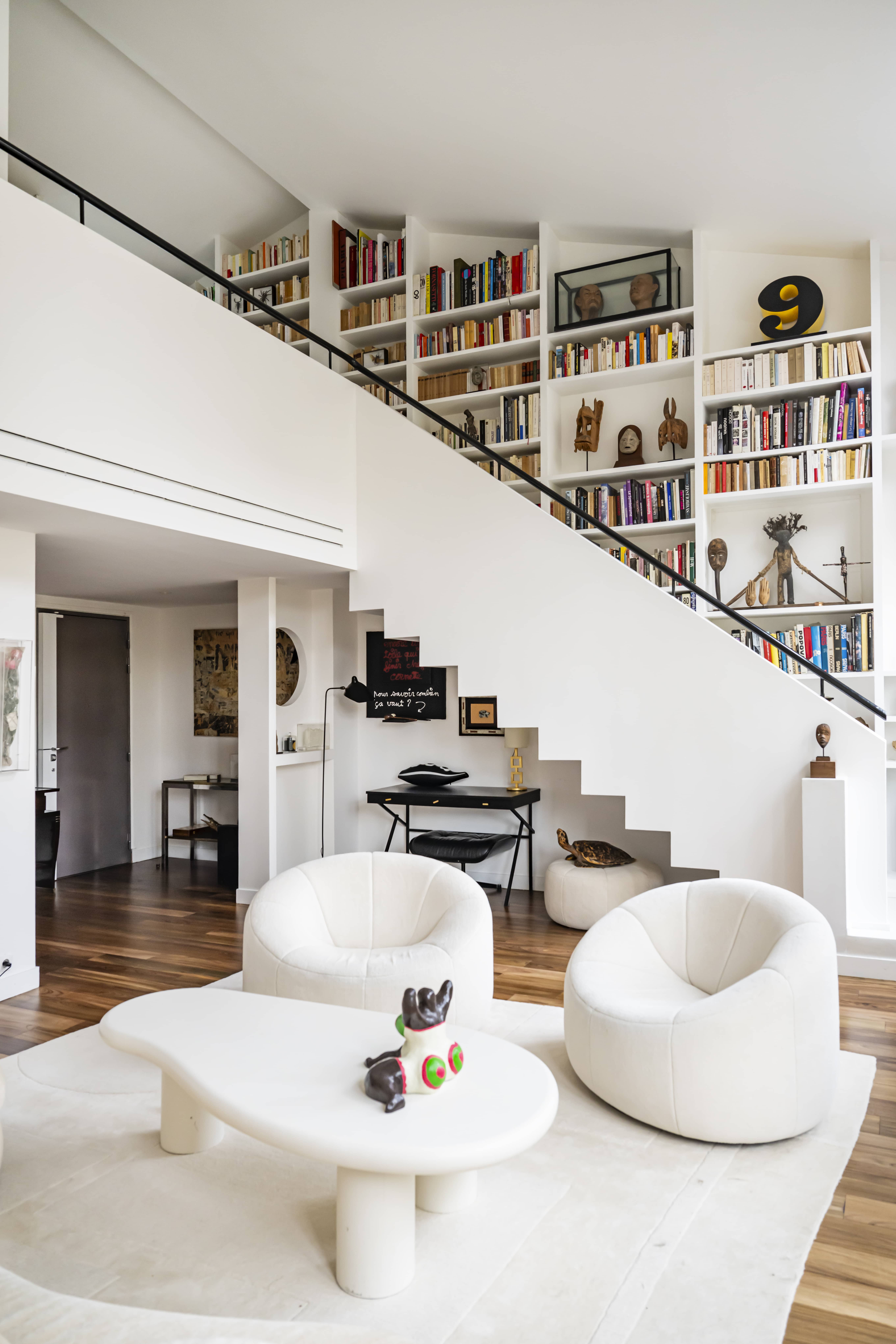 La partie basse va être consacrée aux pièces de réception (entrée, séjour, salle à manger, cuisine). Elle accueillera aussi la suite parentale (chambre, dressing, salle d’eau). La partie haute sera occupée par la mezzanine (zone de travail) et consacrée aux enfants (chambres et salle de bains). Entre les deux, un bel escalier, monumental, longé par une bibliothèque ou se succèdent œuvres d’art de toutes provenances et littérature de tous courant.