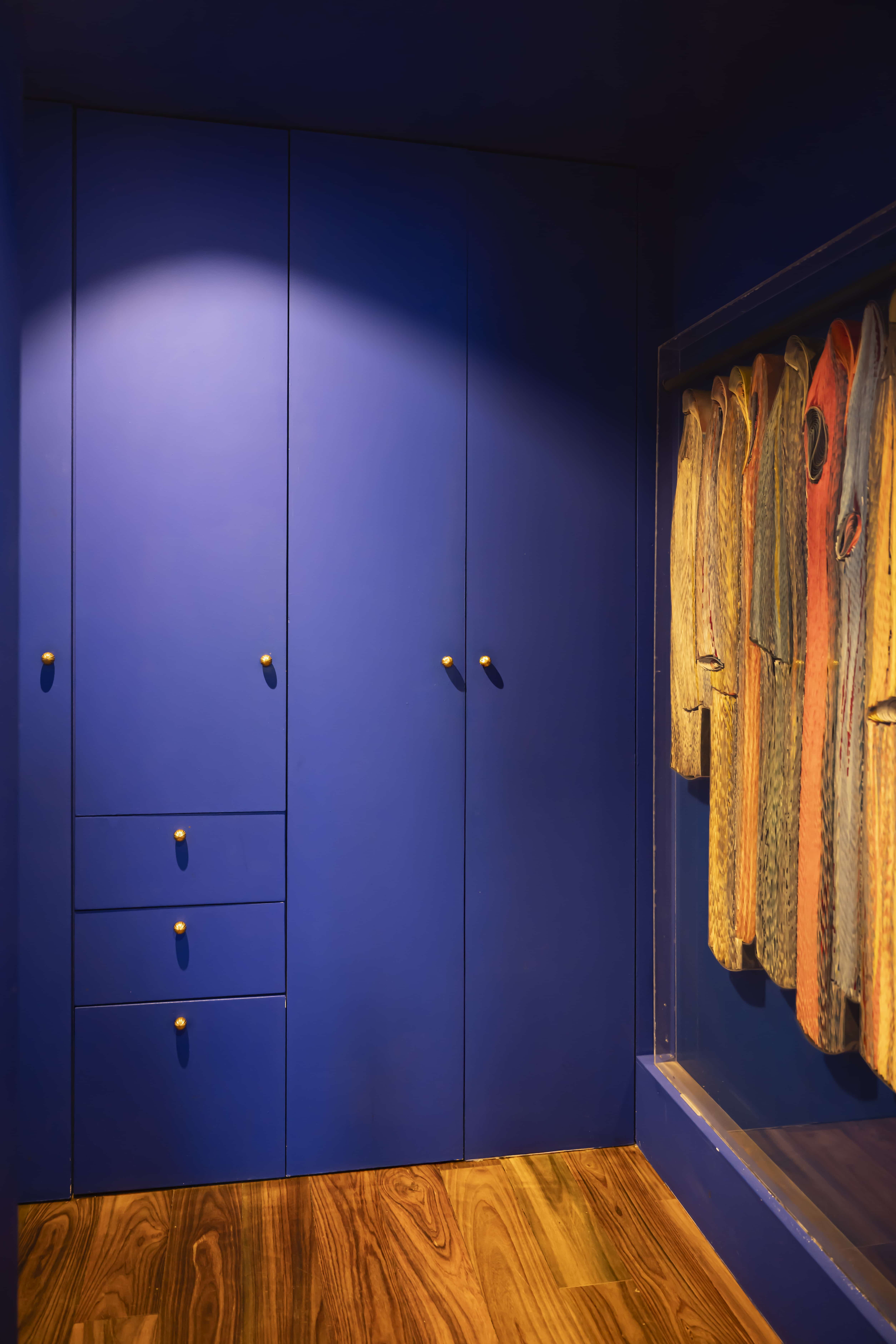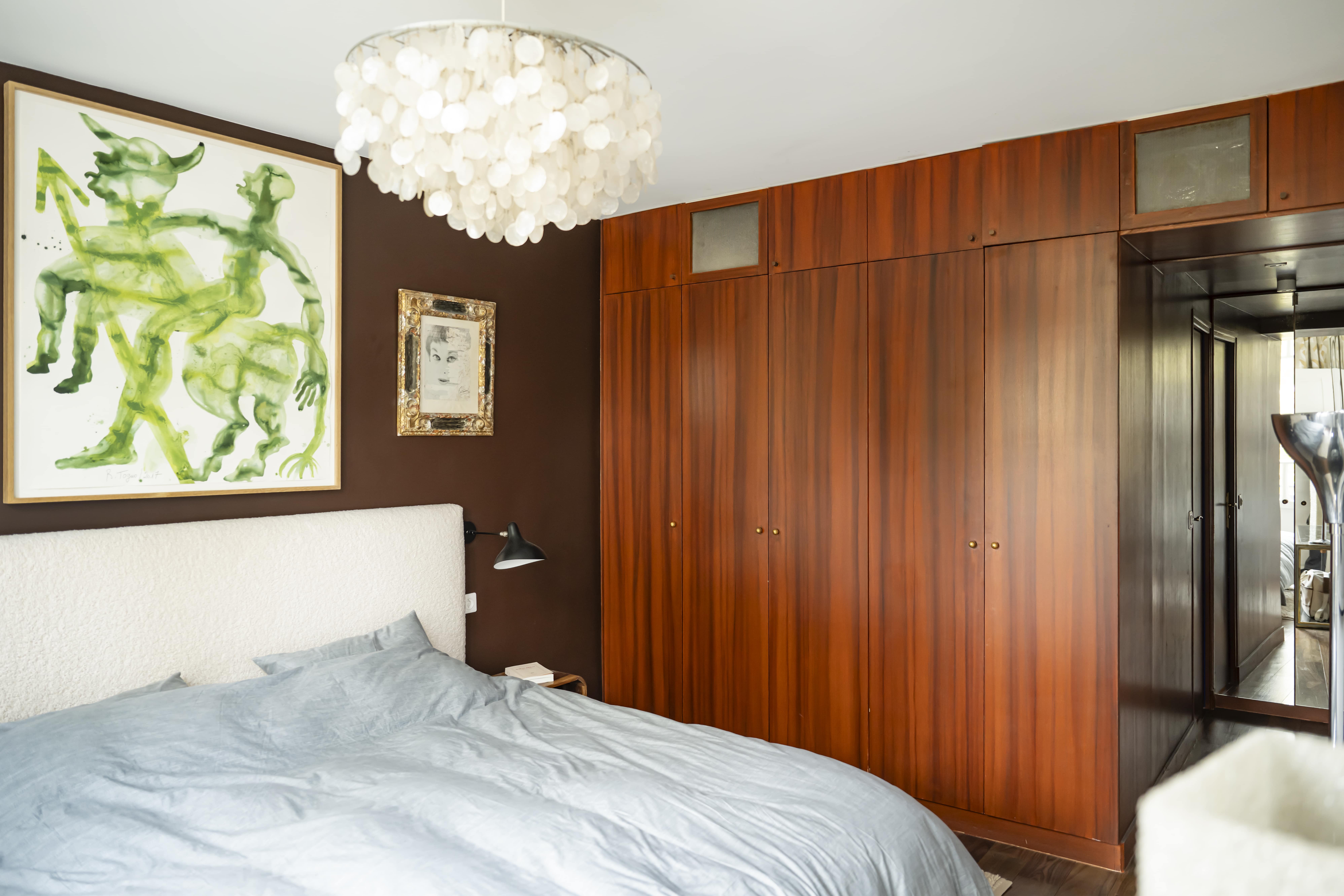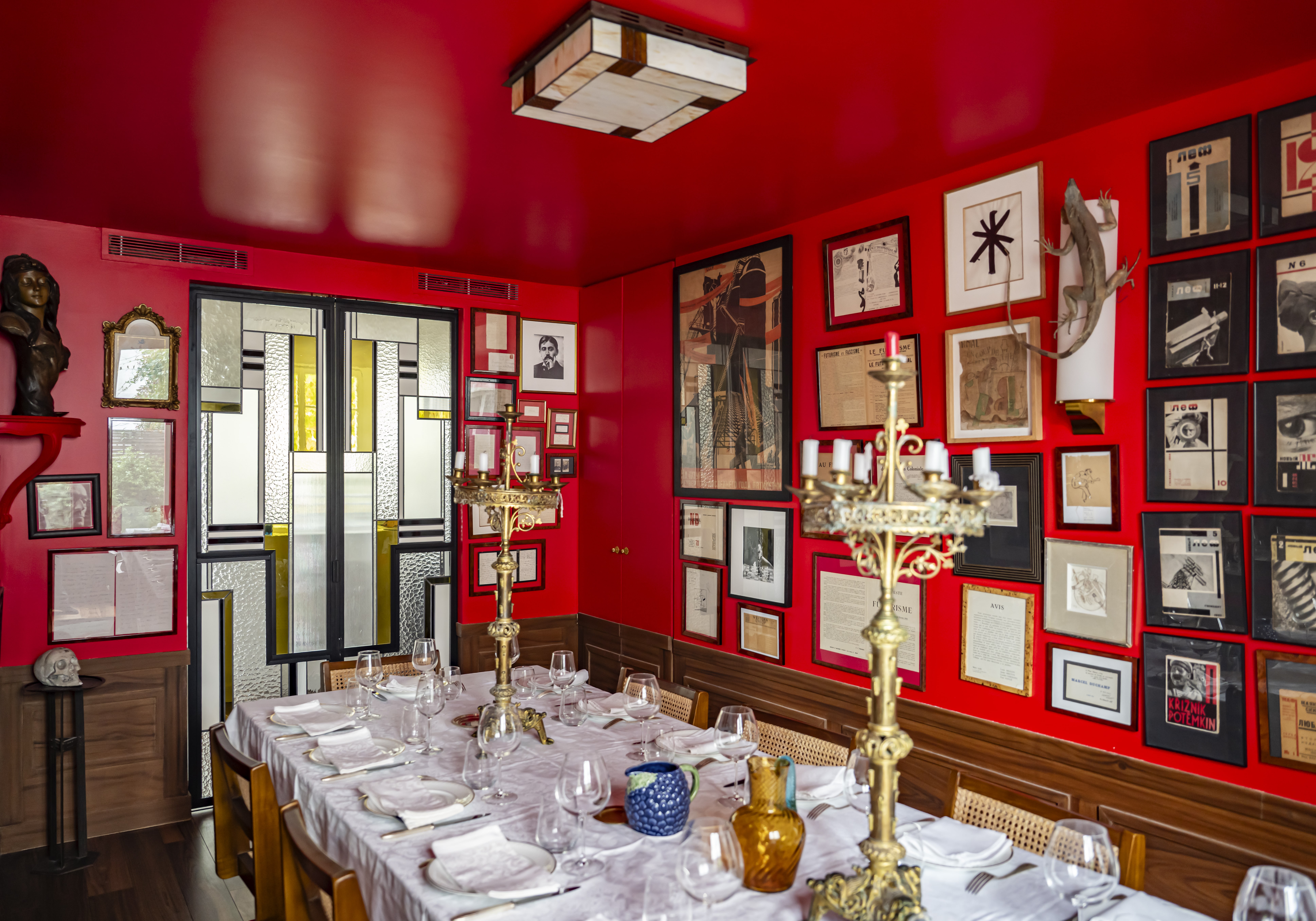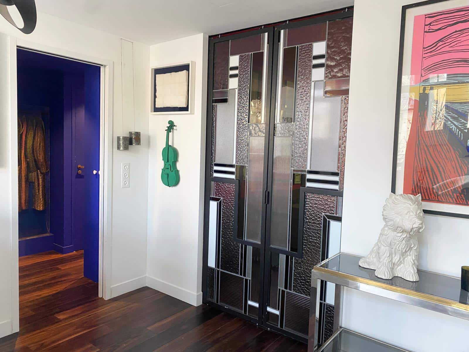 C’est une pièce importante pour ce couple qui aime recevoir. Mais les diners sont aussi l’occasion de s’immerger dans un univers différent. La pièce sera d’autant plus chargée que le reste de l’appartement restera pur : murs et plafonds rouge sang, cimaises en bois, portes coulissantes en verrière multi-verre, et œuvre d’art sur le moindre centimètre.