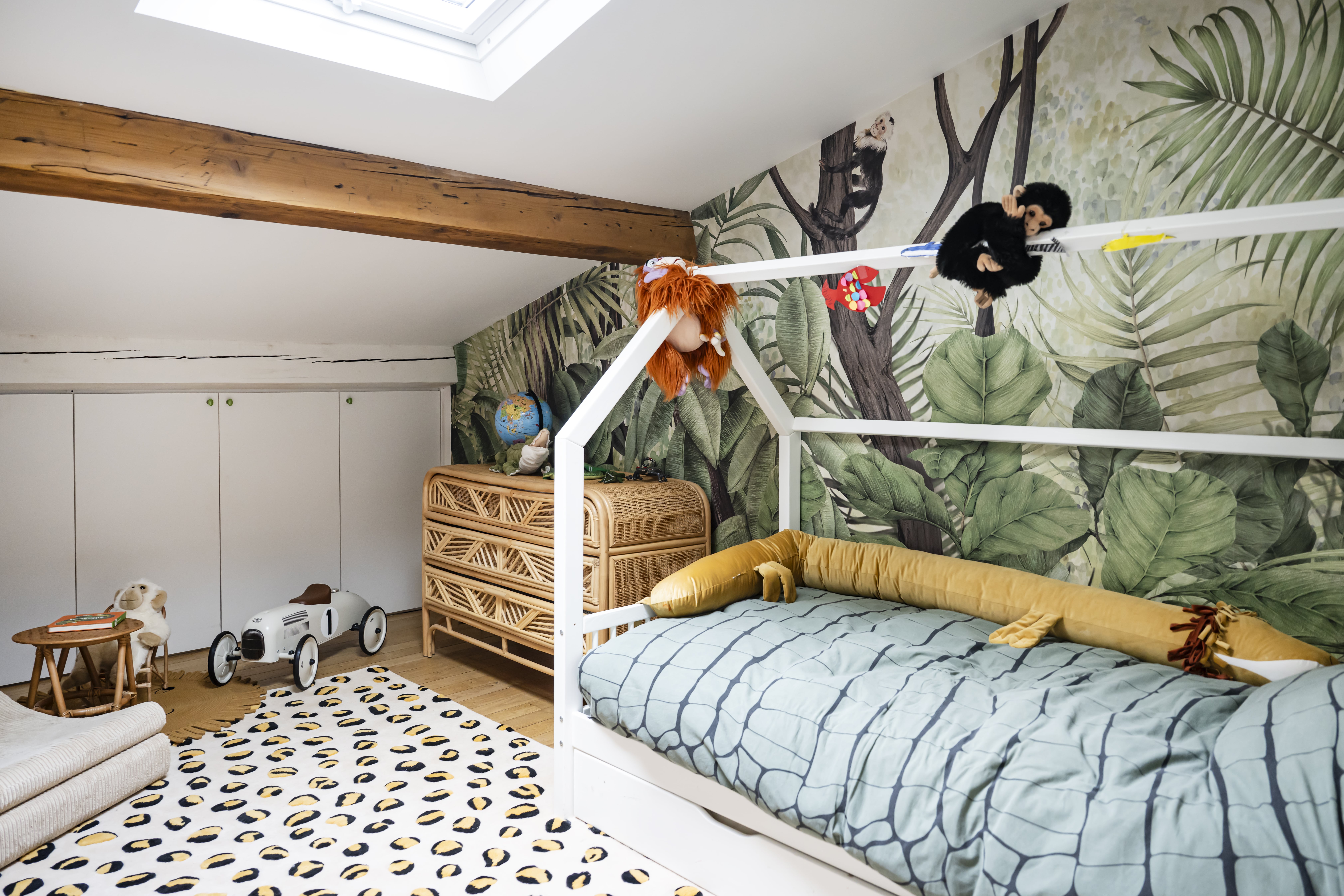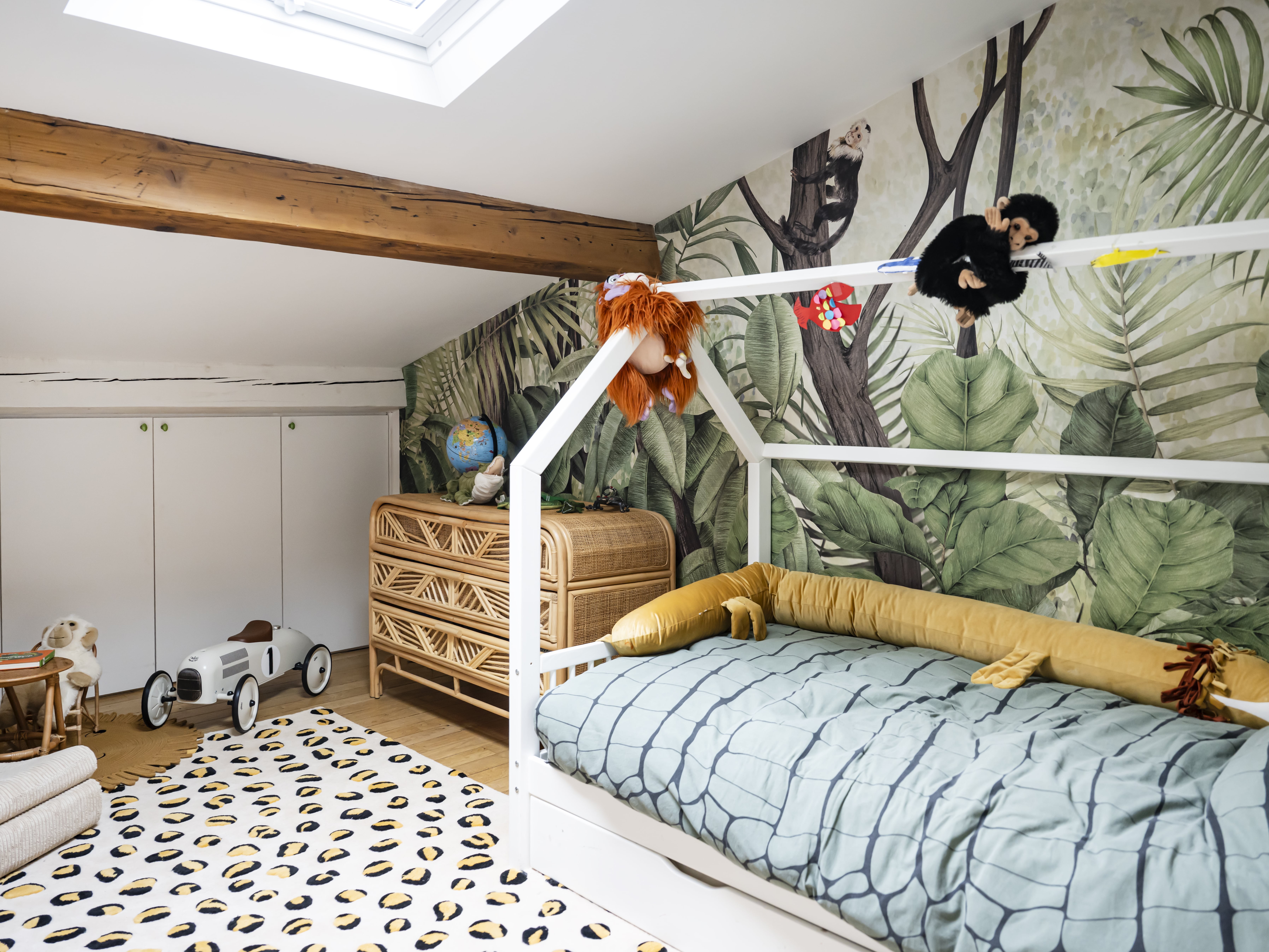 Nous le plaçons sur la largeur du rectangle du salon ce qui présent l’intérêt de redonner à cette pièce une forme de carré allongé plus facile à meubler. Nous le faisons ainsi suivre la pente du toit, ce qui est plus agréable à l’œil. En haut, nous allongeons la mezzanine de 80 cm pour permettre l’installation d’un bel espace bureaux.