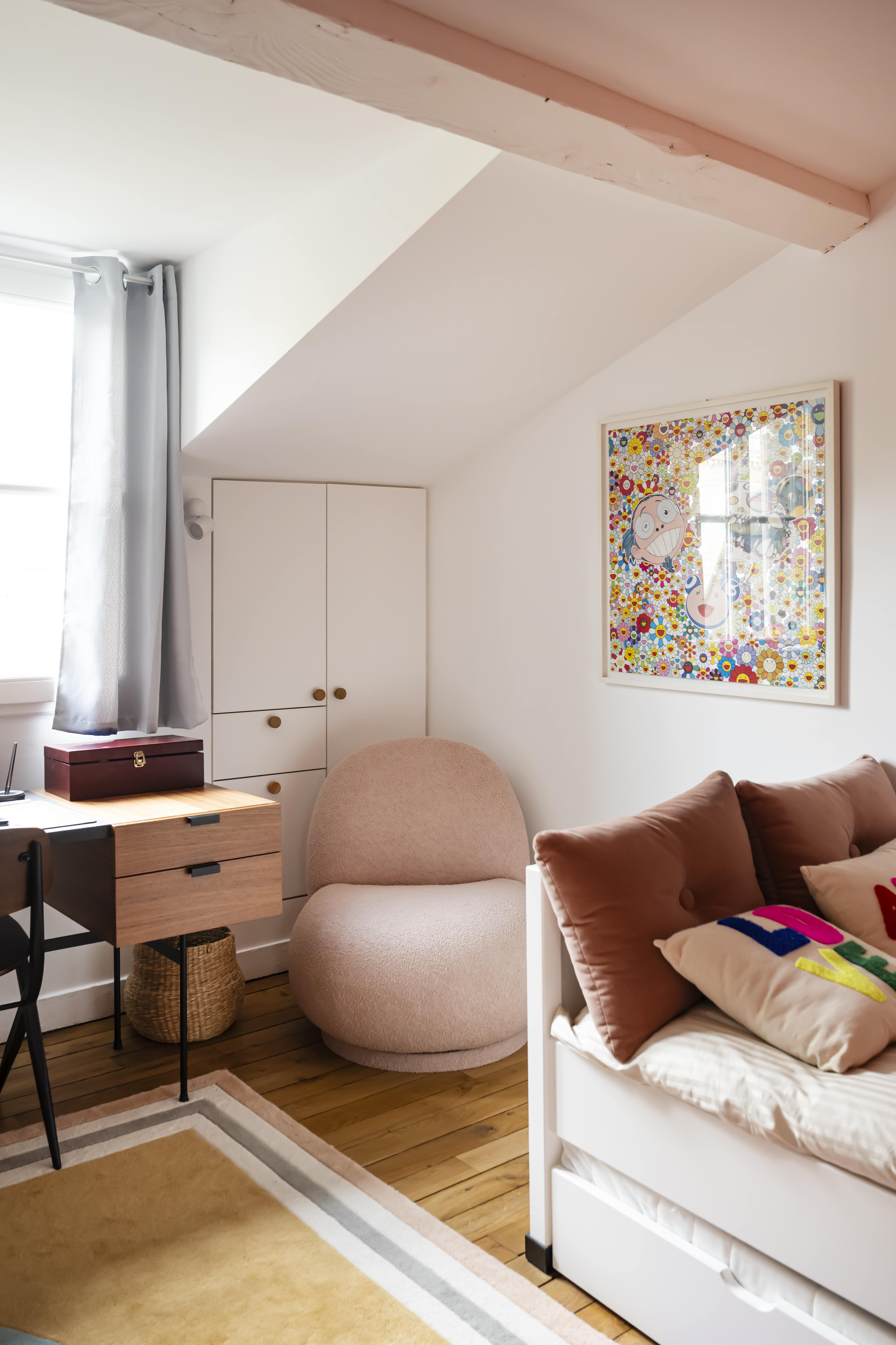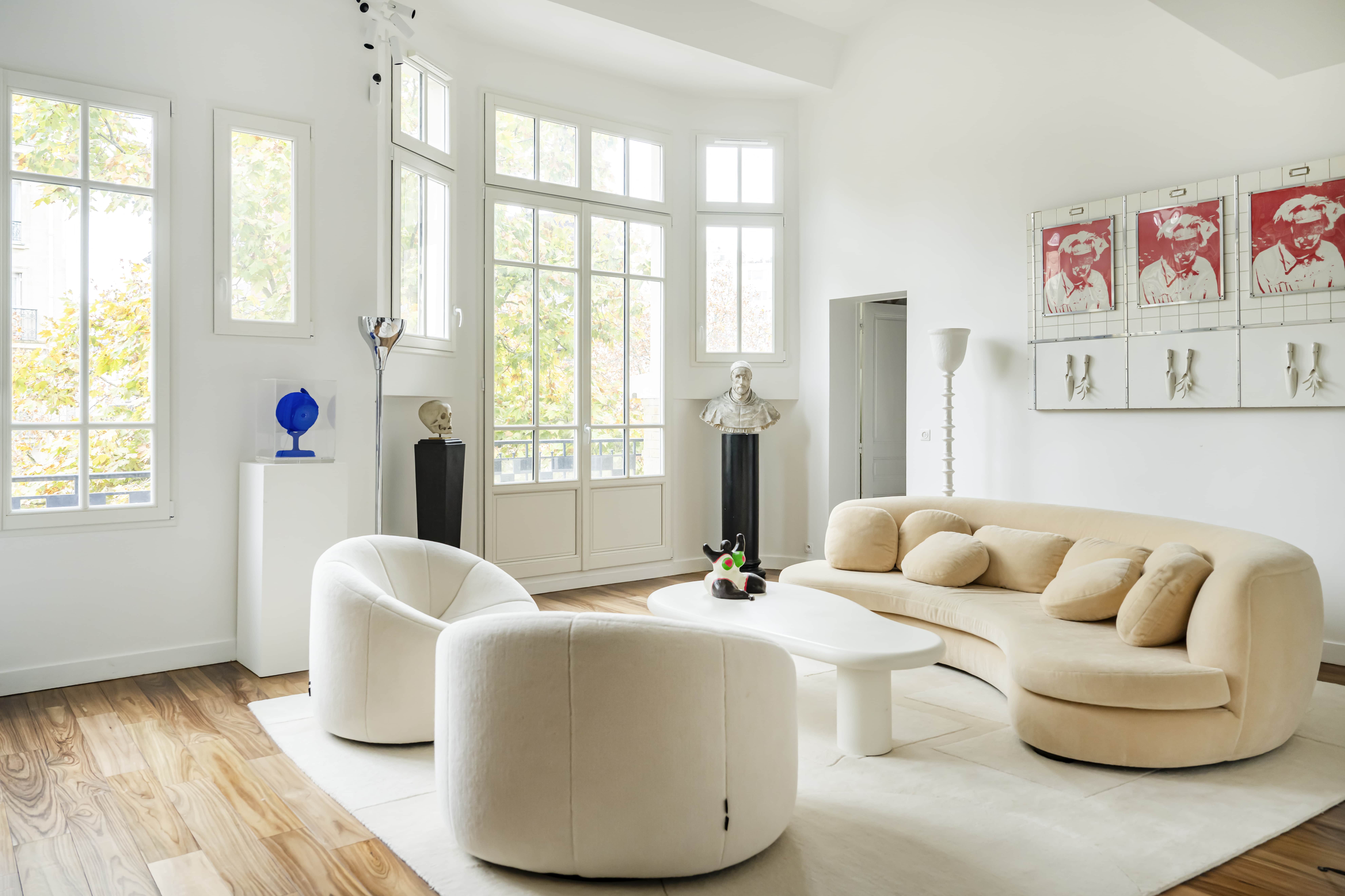 Niché dans le XVe arrondissement de Paris, dans le quartier Montparnasse, cet appartement de 145 m² se situe dans un petit immeuble en pierres de taille construit dans les années 1920. Le dernier étage probablement conçu à l’époque de la construction pour accueillir des ateliers d’artiste est organisé en duplex avec une belle double hauteur et de grandes baies vitrées orientées sur la rue. Le potentiel est là, mais pour l’adapter à la vie d’une famille de quatre, une réorganisation s’impose.
