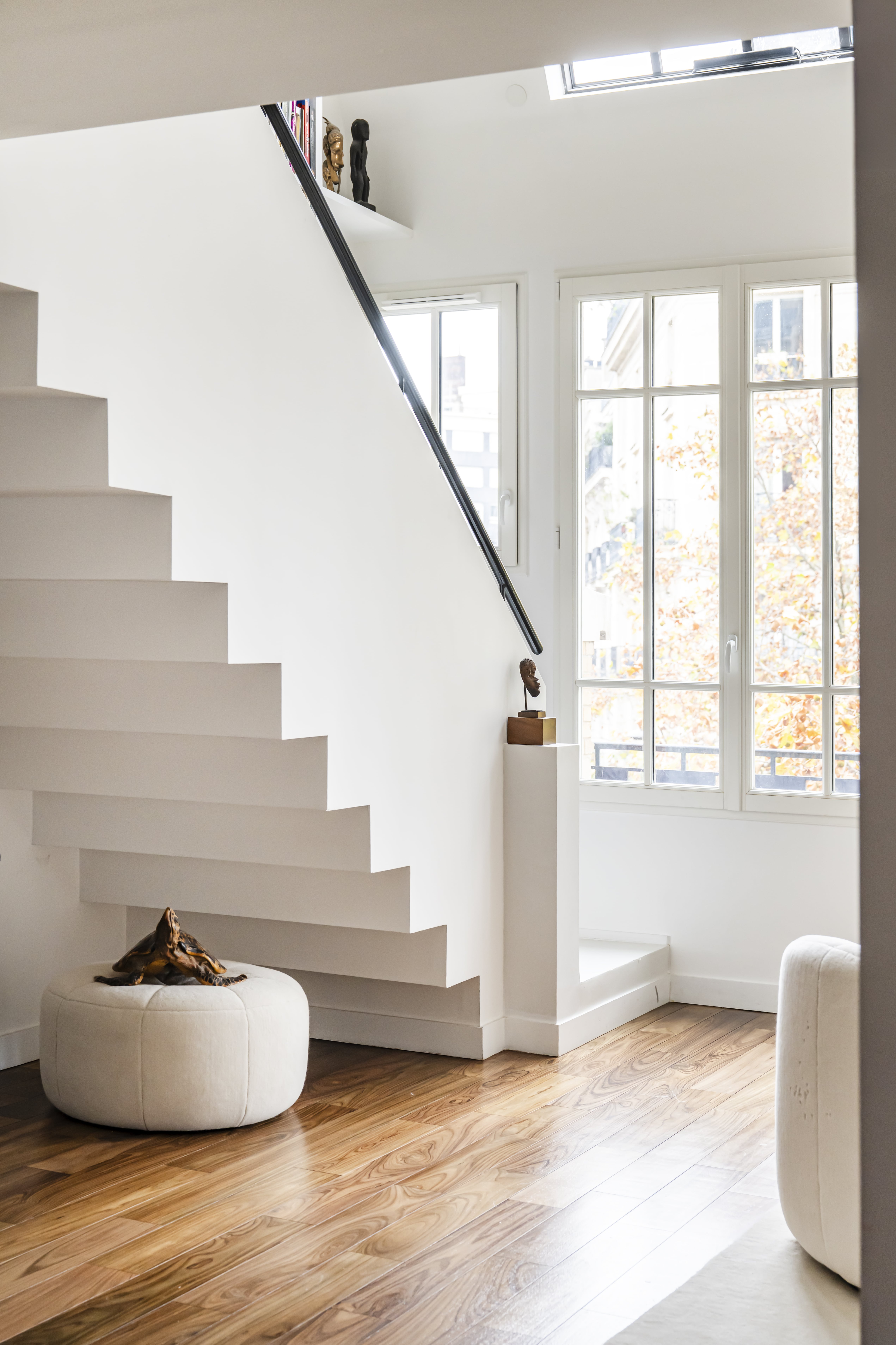 Nos clients ne sont pas seulement férus d’art, ils s’y connaissent aussi en histoire de l’architecture. Et apprécie particulièrement la période Art Déco, contemporaine de la construction de l’immeuble. Ils nous demandent alors de créer un escalier dans le style de l’architecte Robert Mallet-Stevens. Lignes géométriques élégantes et fonctionnelles, style moderne et épuré. C’est en nous inspirant de ses réalisations que nous dessinons le nouvel escalier du séjour.